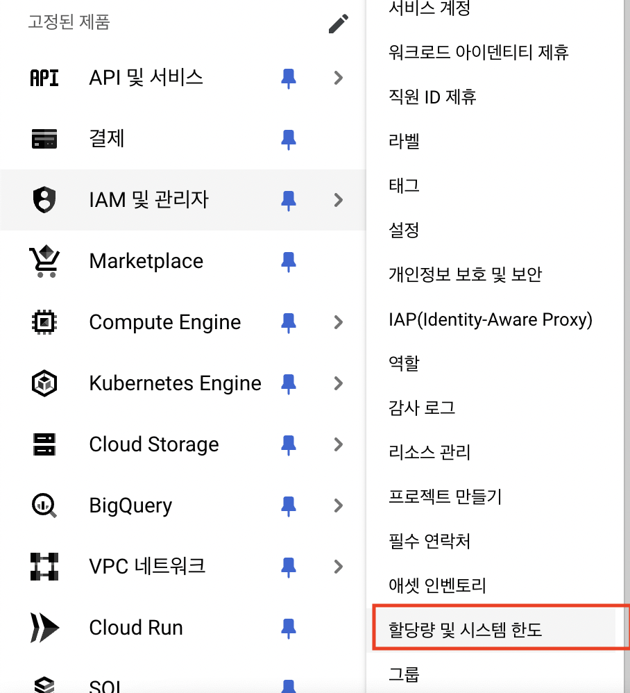 2-1. IAM & 관리자 -> 할당량 및 시스템 한도