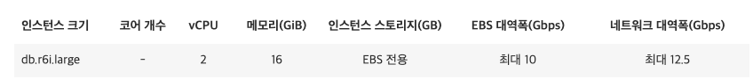 메모리 최적화 r모델의 경우, CPU는 유지한 채 메모리만 16 GiB로 증가시킨 인스턴스로, 현재 데이터베이스에서 메모리 증가의 니즈만 있다면 m5.xlarge (시간당 $0.494) 대신 r6i.large (시간당 $0.30)으로 비용 절감 효과를 볼 수 있다.