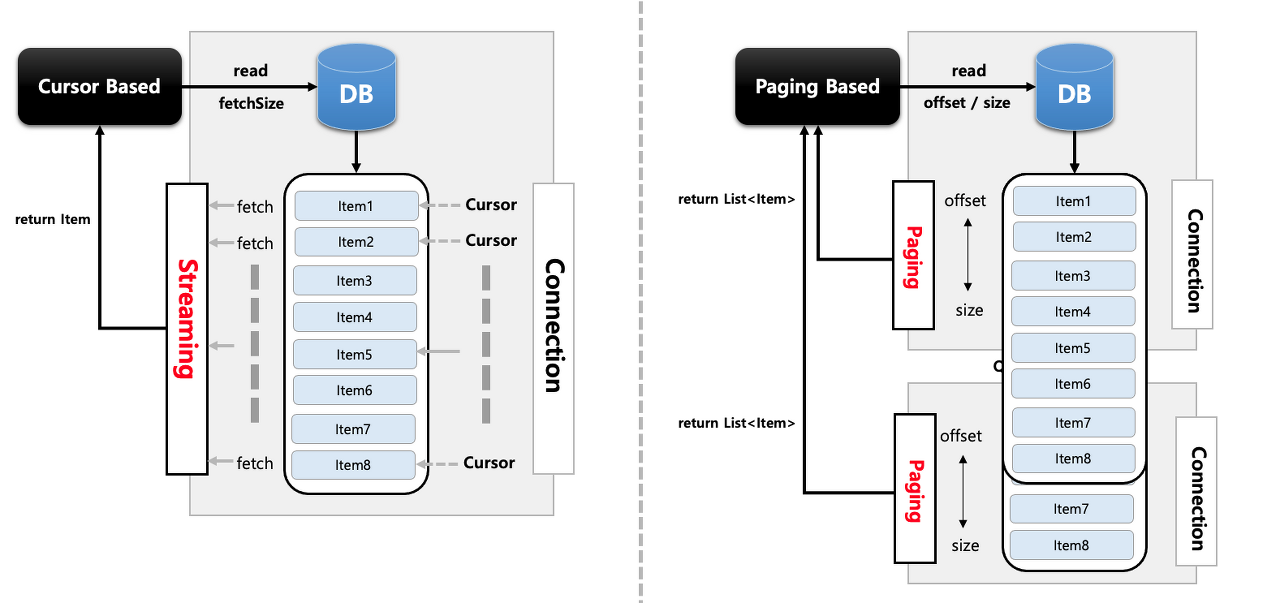 ItemReader는 Chunk 기반 트랜잭션을 다루며 Cursor, Paging 가 대표적인 2가지 방식이다.