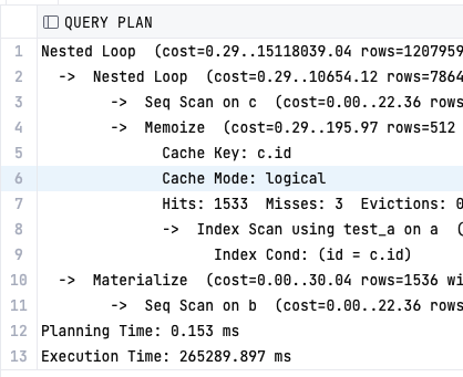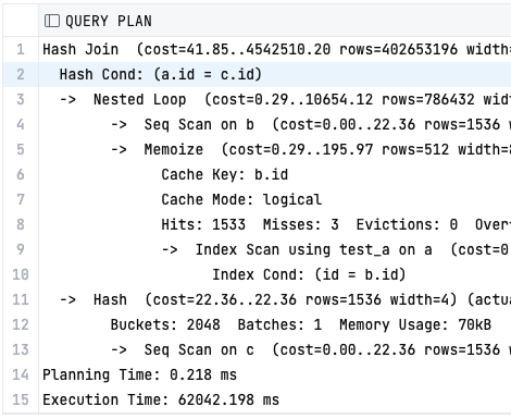 b.ref = c.id 조건으로 B, C테이블을 먼저 조인 후에 A테이블을 조인- a.cid = c.id 조건으로 A, C테이블을 먼저 조인 후에 B테이블을 조인