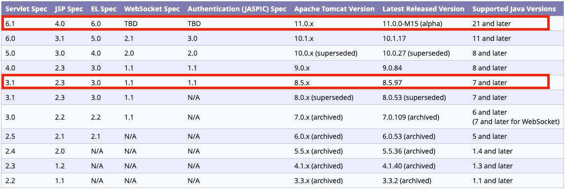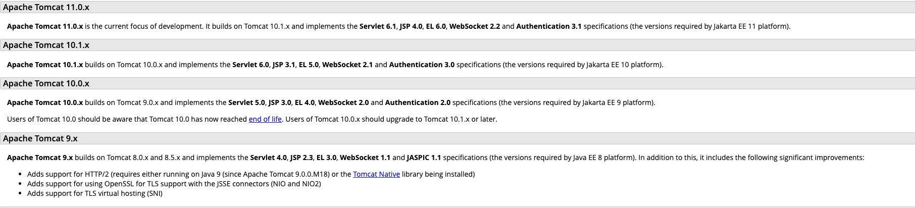 톰캣 11 버전이 필수인 것인가를 확인해 보던 중, 신규 자바 버전에 새로운 기능이 추가되면 버전 호환성 표와는 같아도 일부 기능이 호환되지 않는 것은 정상적인 현상이라는 내용 확인. 또한 이번 Java 변경 사항 중 Jakarta EE로의 전환이 가장 큰 이슈 중 하나이기에, 해당 내용을 적용할 수 있는 최저 버전을 찾아보기로 하였다.