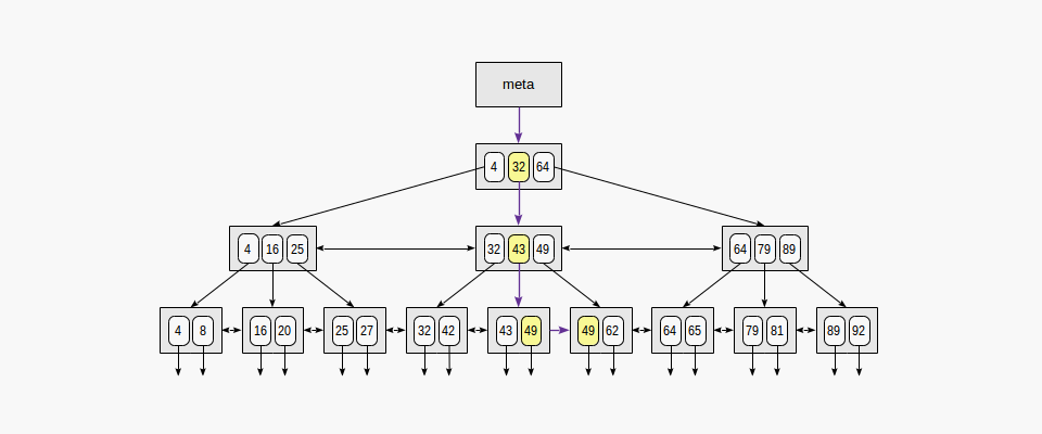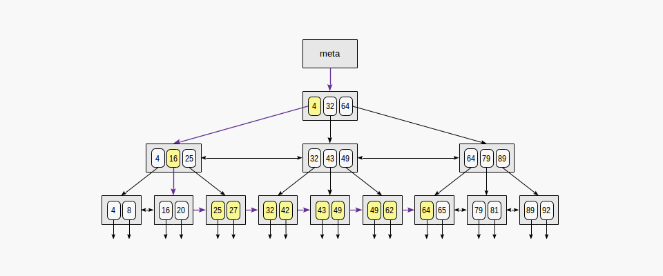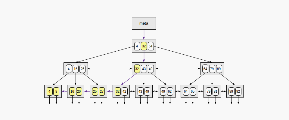 최상위 Root를 Meta page, 최하위 노드를 Leaf page라고 한다.) Root page에서 leaf page들 간의 내부 page 수가 항상 같기에, 어떤 value를 검색하여도 동일한 시간이 걸린다. 데이터는 non-decreasing order로 정렬되어 있고, 동일 레벨의 page들끼리는 양방향으로 연결되어 있기에 (ex. 그림의 25 <->32) 순차적 데이터를 root를 확인할 필요 없이 한 번에 찾을 수 있다.