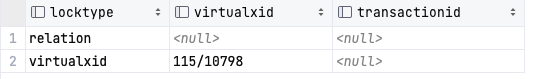 SELECT LOCKTYPE, VIRTUALXID, TRANSACTIONID FROM PG_LOCKS;