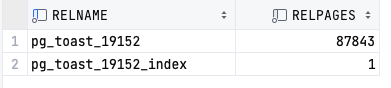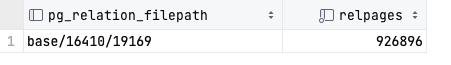 각 "page"는 일반적으로 8kb이며 relpage는 VACUUM, ANALYZE, CREATE INDEX와 같은 몇 가지 DDL 명령문에 의해서만 업데이트된다. 파일 경로 이름은 테이블의 디스크 파일을 직접 확인하고 싶을 때 필요한 정보이다. 예제의 테이블은 인덱스와 파티션이 포함되어 있는 1300만 ROW에 대한 정보로 926,896페이지 용량의(926,896 * 8kb로 약 7.07GB) 테이블이다.