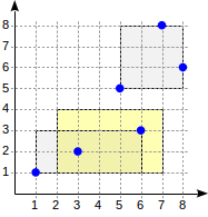 다음 좌표를 보면 (2,1)-(7,4) 사각형은 (1-1)-(6,3)과 겹치지만 (5-5), (8-8) 사각형과는 겹치지 않는다, 그렇기 때문에