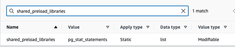 만약 설치가 안된다면, RDS 데이터베이스가 할당된 파라미터 그룹에서 "shared_preload_libraries" 파라미터에 "pg_stat_statements"추가되어 있는지 확인하자